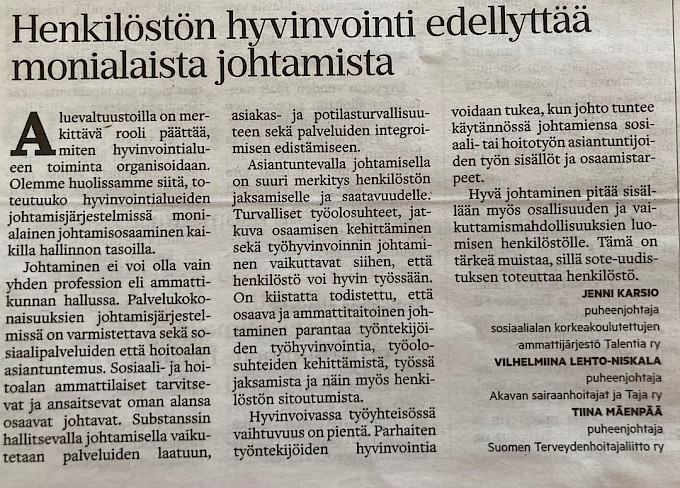 Aamulehti 13.3.2022: Henkilöstön hyvinvointi edellyttää monialaista johtamista